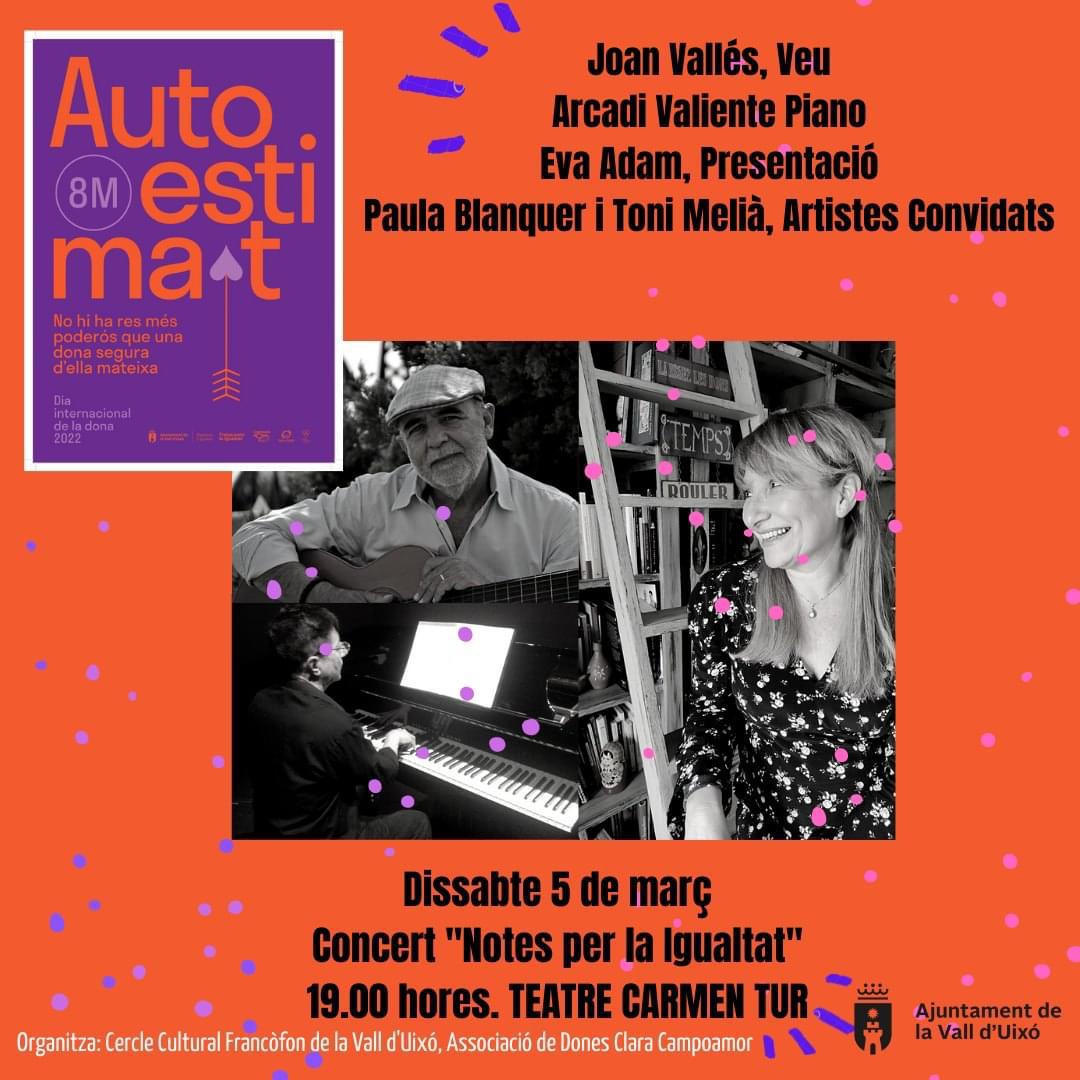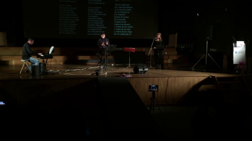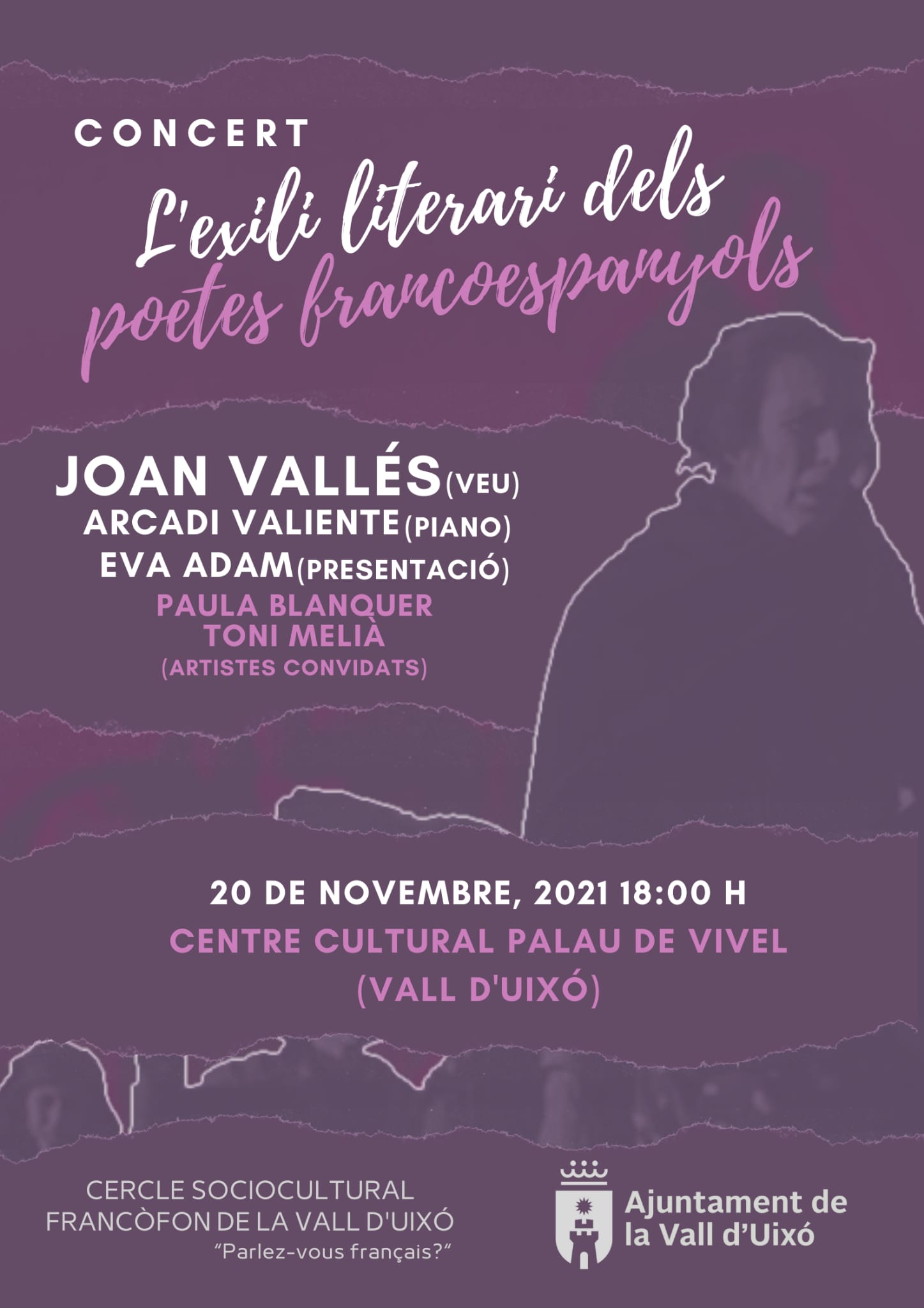 Con la voz del cantautor e intérprete de origen francés, Joan Vallés nacido en Argel, crecido en París y actualmente residente en Valencia (quien compartió en alguna ocasión escenario con Moustaki), acompañado de Arcadi Valiente al piano (pianista de Yves Montand en una actuación y de otras grandes voces de la Nova Cançó) y la palabra de Eva Adam (profesora de francés de la Universidad Politécnica de Valencia, sobrina del compositor, director y musicólogo valenciano Bernardo Adam Ferrero), con arreglos de músicos de la talla de Nacho Mañó (compositor de numerosas canciones de éxito, arreglista, adaptador y bajista, Grammy por su trabajo como Productor músico español), pretendemos rendir homenaje a todas aquellas almas capaces de estremecerse bajo las notas y el recuerdo de la cultura francesa y su tradicional “Chanson Française” en su máxima esencia, llevando a escena las voces de Piaf, Brel, Brassens, Aznavour, Bécaud o Moustaki, entre otros, capaces de conmover y transmitir una emotividad a veces desgarradora a través de la letra de sus canciones proyectadas durante todo el recital con el fin de convertir al público en actor y cantante durante todo el concierto.